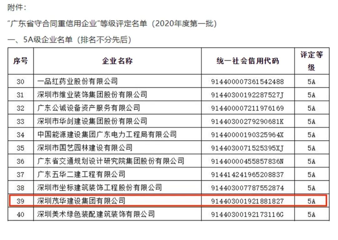 近日,广东省市场协会2020年度首批“广东省守合同重信用企业”等级评定结果公示,茂华建设集团光荣上榜,凭借良好的社会信誉和综合实力,首次荣获5A级“广东省守合同重信用企业”,获此殊荣充分表明了茂华建设集团在合同管理、履约能力、社会信誉等方面成效卓越。此次“广东省守合同重信用企业”等级评定旨在“好中选优”,全省共有618家企业首批申报,只有285家企业通过等级评定;其中5A级74家,4A级113家,3A级98家。