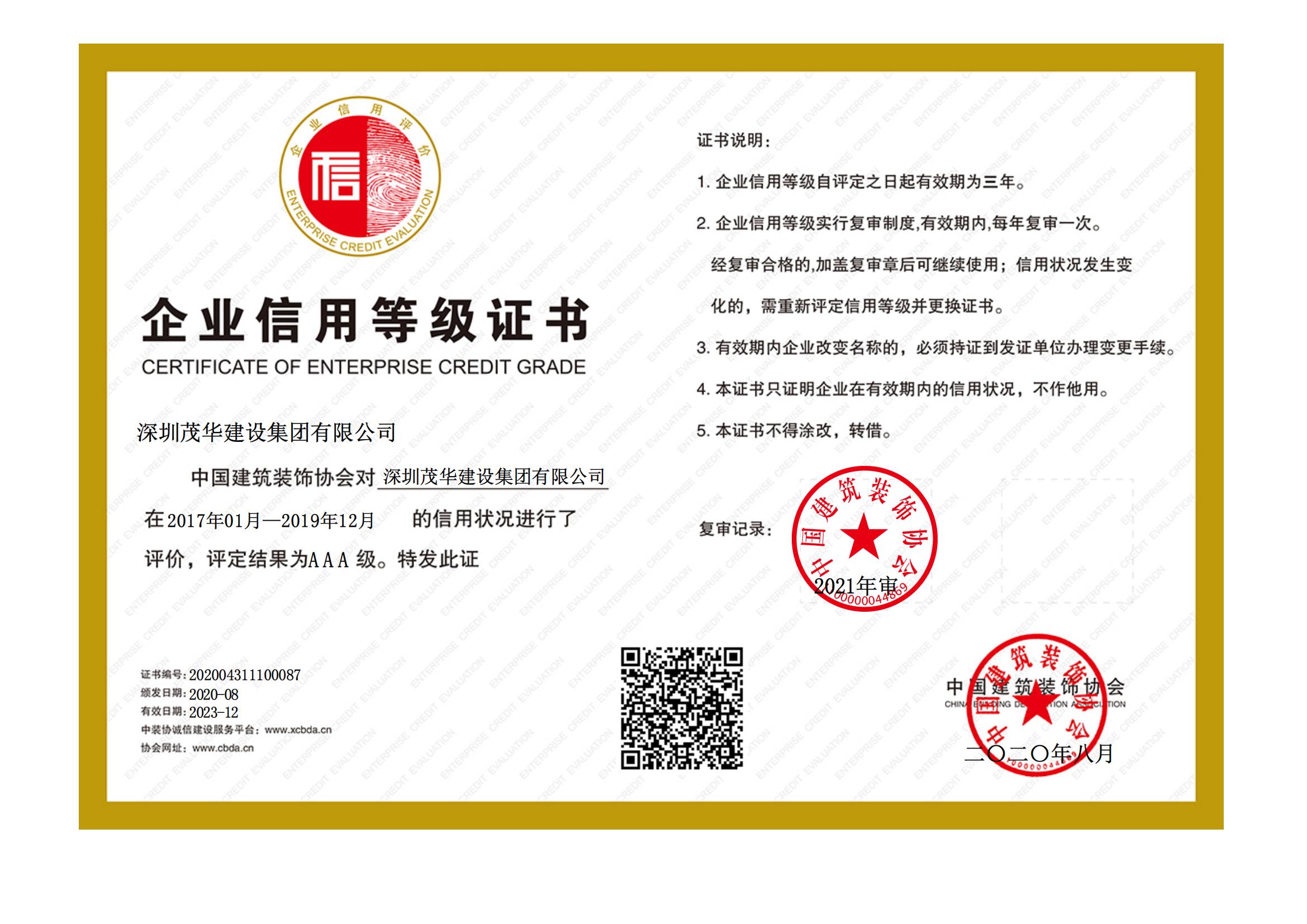 诚信方能长久,诚信赢得未来。茂华建设集团38载匠心筑梦,以诚立业、以诚兴企,把诚信贯穿到集团发展战略及日常经营之中,守法经营,助力行业发展,深受社会各界认可。连续多年荣获“广东省守合同重信用企业”“企业信用AAA等级证书”“中国建筑装饰行业百强企业”等殊荣。此次荣获5A级“广东省守合同重信用企业”,我们将一如既往地加强信用建设,坚守“诚信共赢未来”的核心价值观,致力于装饰品质的持续提高,努力打造一流企业信用品牌,持续为客户创造价值,为促进行业诚信体系建设作出新的更大贡献。
